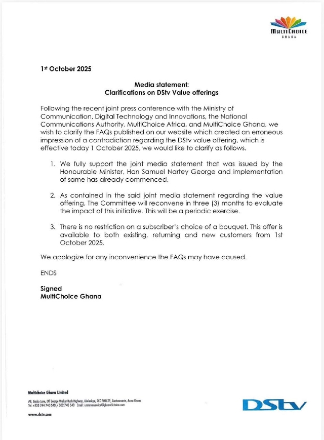MultiChoice, operators of DStv, have issued a statement to dispel an "erroneous impression" created after an frequently asked questions (FAQs) was published on their website concerning the entertainment company's value offering, which is effective today, Wednesday, October 1, 2025.