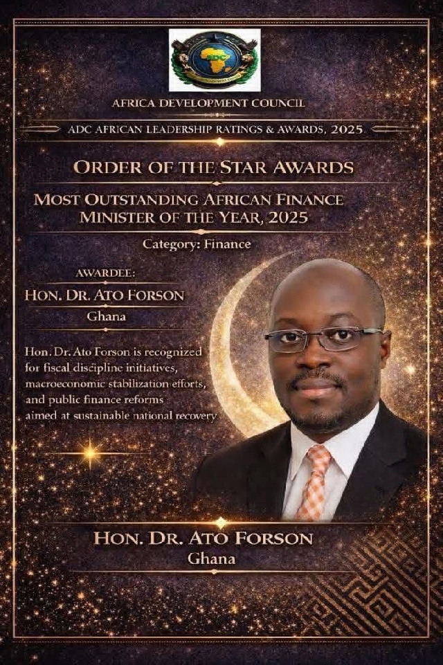 Ghana’s Minister for Finance, Hon. Dr. Cassiel Ato Forson, has been honoured with the Most Outstanding African Finance Minister of the Year 2025 award at the Africa Development Council (ADC) African Leadership Ratings and Awards.