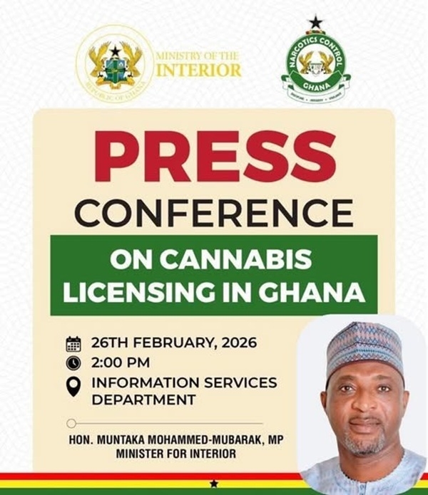 The Minister for the Interior, Muntaka Mohammed-Mubarak, is scheduled to address a press conference today on cannabis licensing in Ghana.