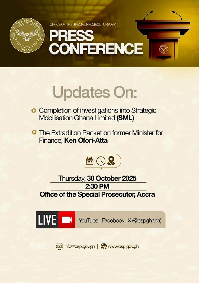 The press conference is scheduled to begin at 2:30 PM at the OSP, Accra.