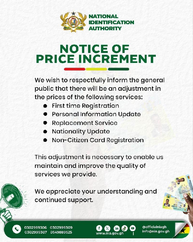 According to the NIA, the new pricing affects a range of services, including first-time registration, updates to personal records, replacement of the Ghana Card, changes to nationality information, and the issuance of cards to non-citizens.