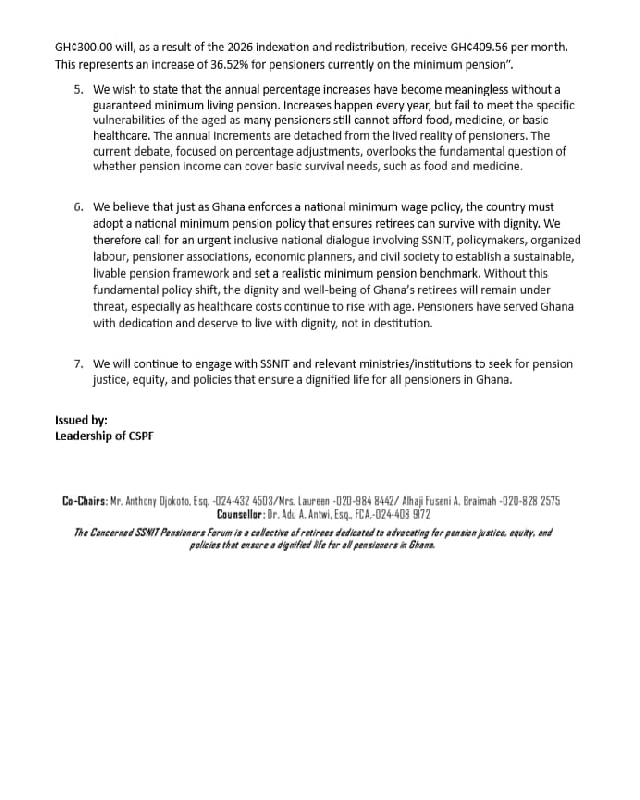 CSPF said it had earlier proposed a minimum monthly pension of GH¢600 and called for an average increase of between 15 and 20 per cent to help restore the real value of pensions.