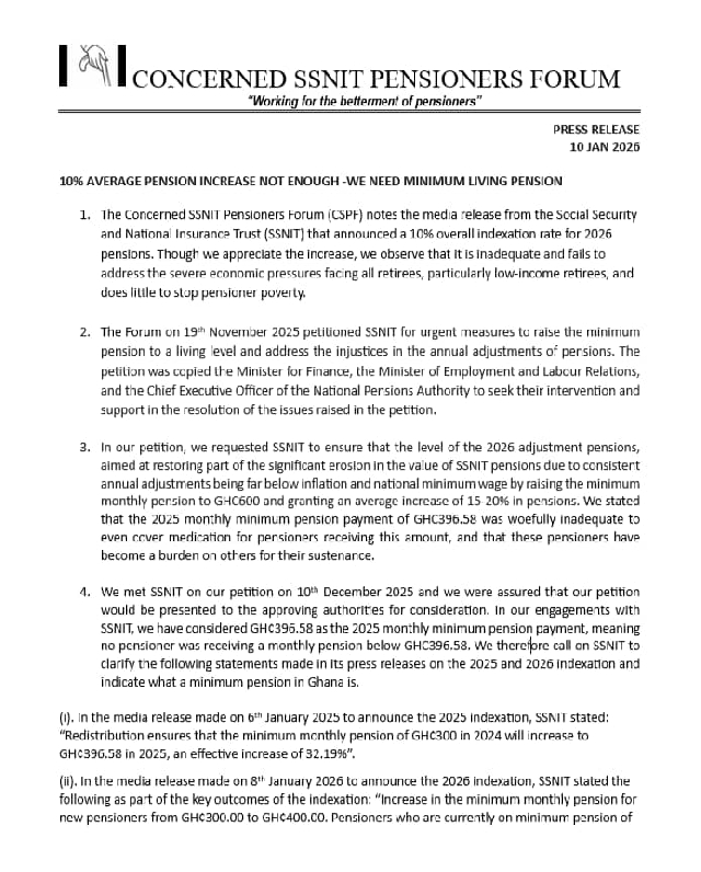 Concerned SSNIT Pensioners Forum (CSPF) has expressed dissatisfaction with the 10 per cent pension increment announced by the Social Security and National Insurance Trust (SSNIT) for 2026, describing the adjustment as inadequate.