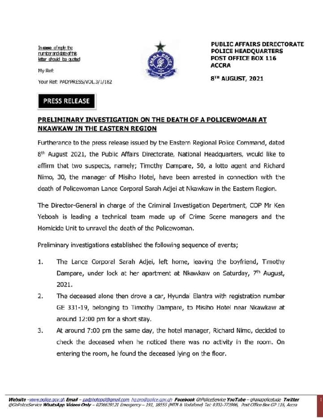 An earlier police report said they received a call from Mr Richard Nimo, the manager of Misiho Hotel at Akwasiho near Nkawkaw that the late policewoman, believed to be in her mid-twenties, booked the hotel at about mid-day on Saturday but was found dead around 7 pm as he checked up on her.