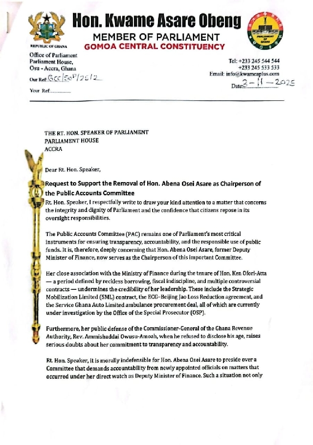 The MP for Gomoa Central Kwame Obeng-Asare, alias A-Plus, has formally written to the Speaker of Parliament, Alban Bagbin, to request his support for the removal of Abena Osei Asare as Chairperson of the Public Accounts Committee.