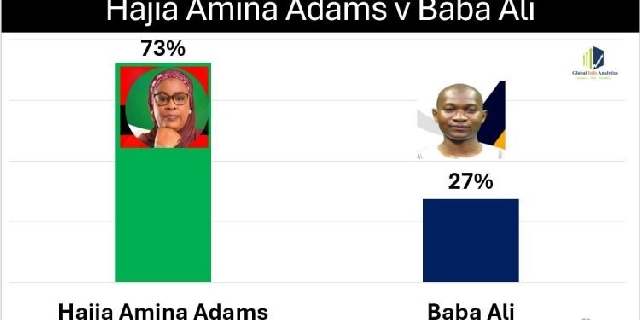 According to the poll, NDC aspirant Hajia Amina Adams commands a strong lead over the NPP’s Baba Ali, polling 73 percent of voter support against 27 percent.
